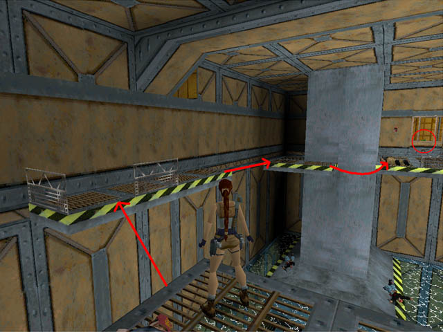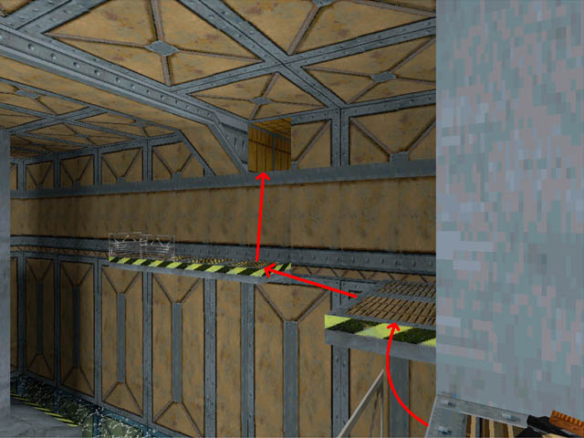 Begebt euch zur hinteren Wand und springt aus dem Lauf leicht nach rechts zu dem gelb-schwarz markierten Steg unterhalb einer Wandöffnung. Dies ist der Ausgang. Bevor ihr hinein lauft, müsst ihr allerdings noch die grüne Karte finden. Lauft nach rechts und springt weiter zum oberen Gitter am Pfeiler. Springt dann aus dem Lauf nach rechts weiter. Hier ist ein leicht nach links gerichteter Sprung erforderlich. (1. Bild) Zerschießt das Fenster und klettert in die Nische um dort die Grüne Karte30/31 einzusammeln. Hier kann man noch mal zum Secret 3 gelangen, wenn man es noch nicht hat. Runter springen und dann den Weg bis zum Ausgang noch mal nehmen. Begebt euch wieder an den Rand und springt wieder aus dem Lauf nach rechts um die Ecke auf die drei Gitter dort und ebenfalls mit Anlauf weiter auf den Steg unter dem Ausgang. (2. Bild) Zieht euch in den Gang hinein und folgt diesem nach rechts hinauf. Rechts findet ihr eine Leiter, die ihr hinauf klettern müsst. Begebt euch am anderen Ende des kurzen Ganges gebremst hinab, um in dem Gang, der zur Kammer mit dem Kartenleser führt, zu landen.