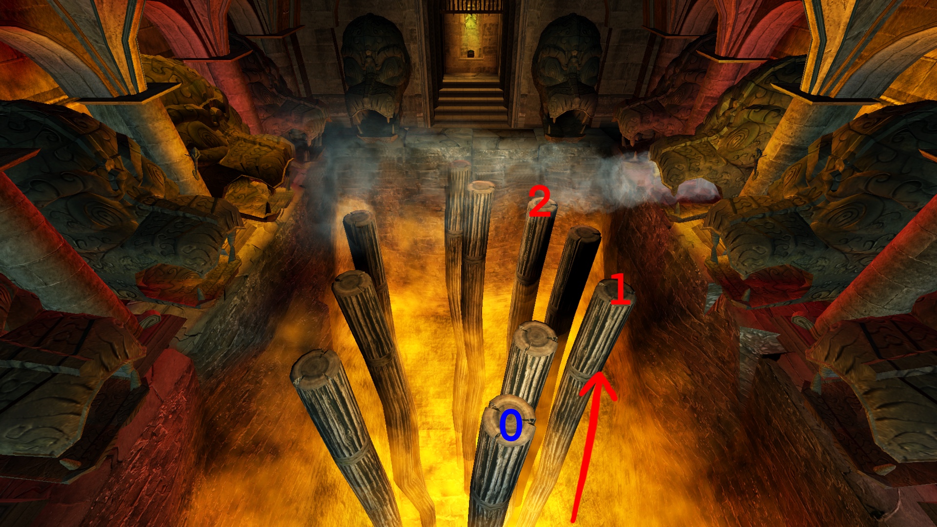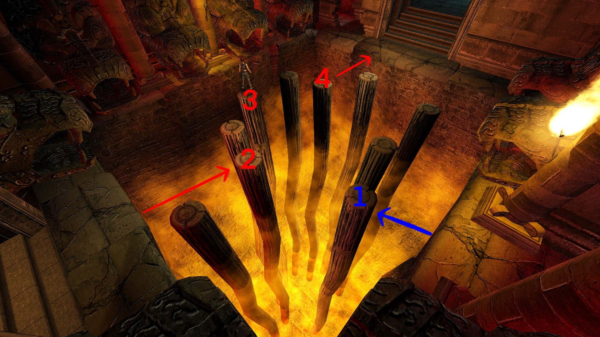 Wendet euch leicht nach rechts und wartet ein wenig, bis der zweite Stamm dort möglichst weit von euch weg schwankt, um dann mit einem normalen Sprung sicher darauf landen zu können. (4) Springt nun über den letzten Pfeiler hinweg zur Kante des Ausgangs. Greift danach und zieht euch hoch. Lauft zurück zur Tür hoch, um zur Halle der Jahreszeiten zurückzukehren.